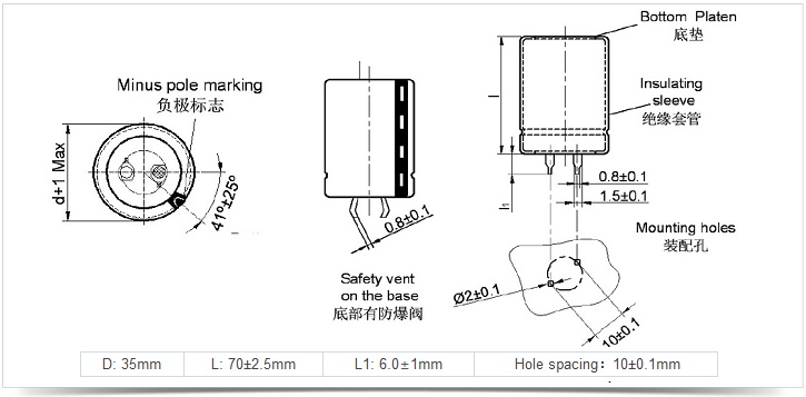 Dimension of 450V, 1000uF snap-in aluminum electrolytic capacitors